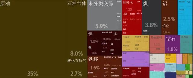可以看到原油,石油气体,液化石油气,煤,铝,铁这些能源和原材料出口,占据了出口绝对大头