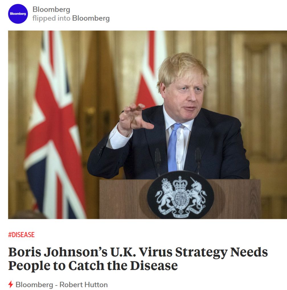 Boris Johnson’s U.K. Virus Strategy Needs People to Catch the Disease(翻译:英国首相的防疫策略是,先让人民感染病毒)