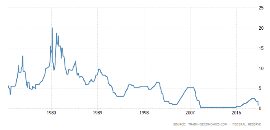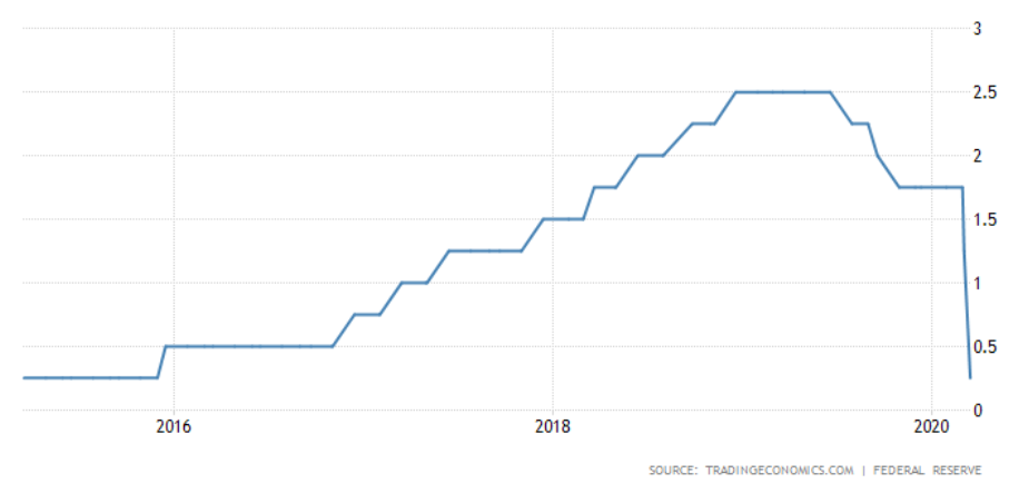 此外,美国财长努钦表示,美联储和财政部争取提供“不设限的流动性”,还有更多的后续措施提振流动性。美联储的突然大幅降息,意味着人类历史上最大的宽松,正式到来!按照美联储的日程表,3月的议息会议是在17日到18日,也就是说:如果按部就班,美联储最早只能在北京时间3月19日凌晨宣布降息。然而在3月3日,美联储就迫不及待地突然降息,幅度是50个基点。而今天的降息,仍然采用的是突然降息(非常规会议降息),幅度加大到了100个基点。短短半个月,美联储降息了150个基点,这是极为罕见的,即便在2008年前后的金融危机期间也没有达到这种程度。自1998年以来,美联储“非常规会议降息”只发生过9次,其中3次在“科网股泡沫破裂+911”期间,3次发生在“金融风暴期间”,2次在此次新冠肺炎期间。其中2007年到2008年金融风暴期间的三次特殊降息分别是:很显然,即便在金融风暴期间,美联储的单次降息也没有达到100个基点。所以,今天凌晨的降息,是创纪录的。美联储正常降息幅度是每次25个基点,也就是说今天一次降息相当于平常的4次降息!值得注意的是,此次降息之后,联邦基金目标利率到了“0到0.25%”的区间,这就是零利率!如果下次再降息25个基点,区间将变成“-0.25%到0”!所谓“扩表”,就是增加购买美国国债和“机构支持抵押贷款证券(MBS)”,这相当于增加市场里现金数量。其作用,有点类似中国的降准。而MBS是房利美、房地美等机构发行的证券,美联储购买MBS,等于把钱交给美国的房地产市场。由此可见,即便是实体经济发达的美国,也把房地产视作支柱产业。下图是最近5年美元利率走势,可以看出近期出现断崖式下跌: