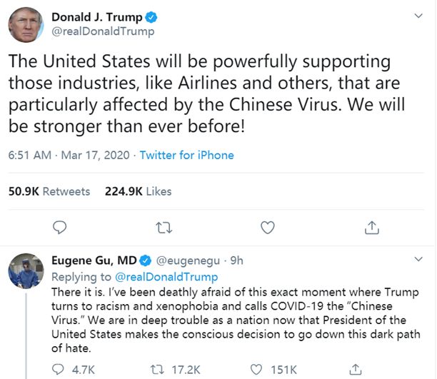 批评者指责特朗普这是“种族主义”,种族主义治不了新冠肺炎,只会把世界拖向更黑暗的深渊。