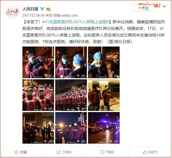 如今,经过中国人民长达近两月的艰苦努力,疫情在我国已逐步得到控制,多省清零,连湖北新增也实现了个位数,41支援鄂医疗队已分批撤离。