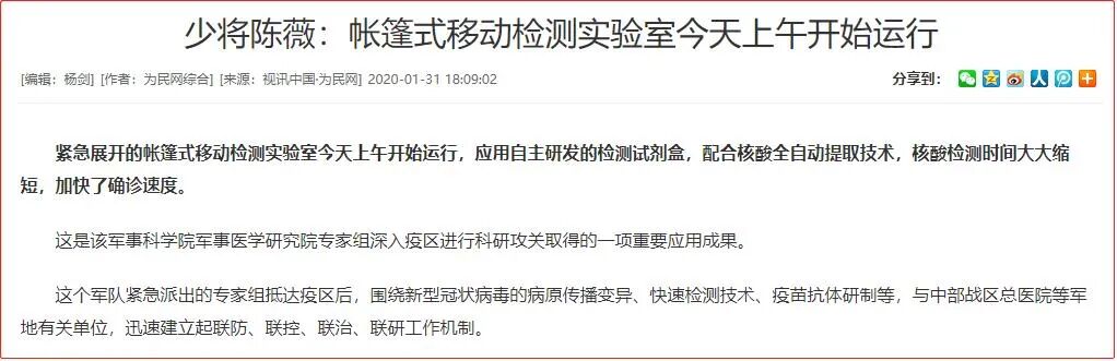 在武汉,陈薇团队第一时间应用自主研发的检测试剂盒,配合核酸全自动提取技术,加上紧急展开的帐篷式移动检测实验室,很快实现了新冠病毒快速检测。