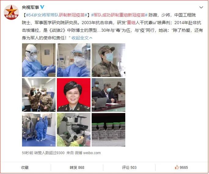 那时候我就在想,作为阻击“非典”、抗击埃博拉威震四方的“名将”,陈薇团队这一次,一定又在憋什么大招,一定不会令国人失望!