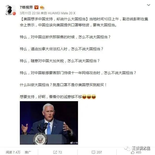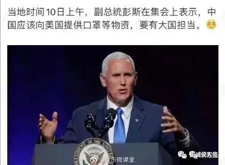 彭斯负责美国的新冠疫情防控工作,求人就要有求人的觉悟,扯什么犊子,装什么逼啊,还大国担当,中国没学你们美国落井下石就不错了,看看上图中国网友的五连问扎心不扎心,你们对中国禁售断这断那的时候,考虑过大国担当吗?你们逼加拿大绑架孟晚舟的时候,有考虑过大国担当吗?你们对中国各种加关税的时候,有考虑到大国担当吗?对中国要害部门网络持续11年的攻击,你们有考虑过大国担当吗?更有意思的是,美国此前跟中国打贸易战的时候,将口罩等防疫物资也列入加征关税清单,结果美国疫情爆发了,自己悄悄取消了口罩等物资的关税。