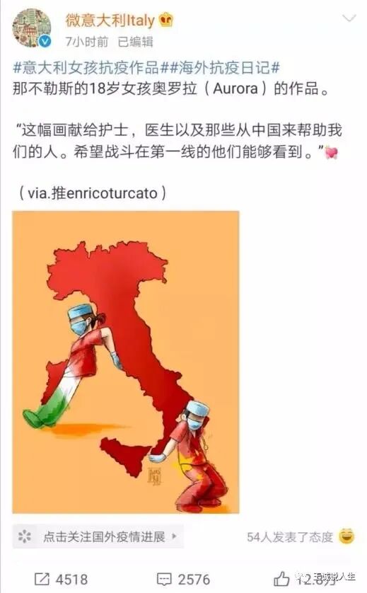 意大利人民纷纷对中国医疗专家和中国人民表示感谢,不但中国驻意大利使馆的网站被意大利人民的答谢回复霸屏了,就连运送物资的东方航空也在意大利圈了一大波粉丝。最让人感动的是,一位意大利那不勒斯18岁的小姑娘奥罗拉画的一幅漫画,她说“这幅献给护士、医生以及那些从中国来帮助我们的人,希望战争在第一线的他们能够看到!”这幅可爱的漫画在全球互联网都刷屏了,必将成为中意友谊的传奇故事!