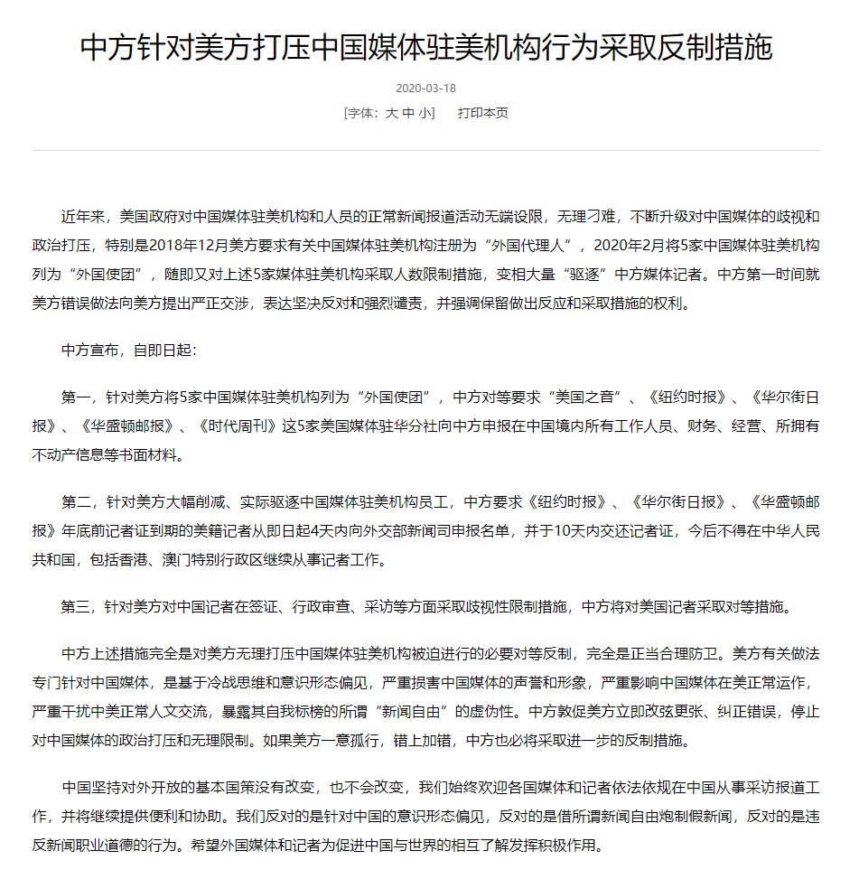 这是今天凌晨外交部网站挂出来的公告,中国再次重拳出击,对《美国之音》、《纽约时报》、《华尔街日报》、《华盛顿邮报》和《时代周刊》五家美国媒体实施制裁!就是这么硬刚,今日的中国早已无惧美国!