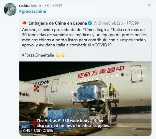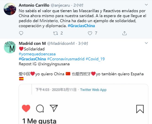 西班牙人直言不讳地说:“美国人把我们当蝗虫,而中国却在帮助我们。你们还要继续那些操蛋的种族主义言论么?”特朗普不久前中断了欧美之间的航班和人员往来,让西班牙人很不爽。甚至还有西班牙人说,中国为意大利和西班牙所做的比本国政府还多。当然别当真,人家这是在敦促自己的政府向中国学习,加把劲呢!