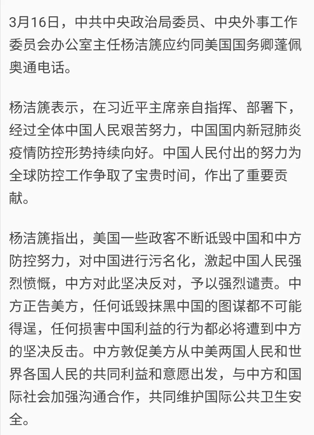 首先,是蓬佩奥主动要求通电话;其次,谈话内容和疫情有关;最后,中方训斥了美国政客对中国抗疫的污名化,要求美国改正。