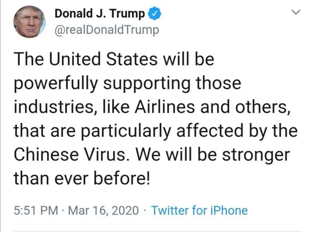 “美国将给受'中国病毒'影响的那些工业,比如航空业和其他行业,提供强大的支持。我们将比任何时候都更强大!”