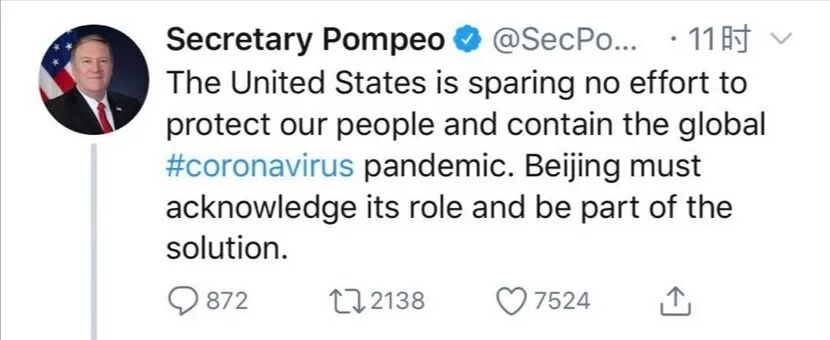 蓬佩奥的意思是说,病毒在美国爆发是中国的错,现在你来帮美国是你的责任。