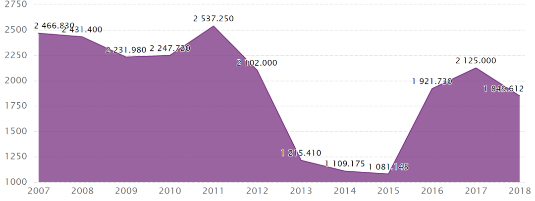 这是历年来美国对韩国出口的石油和天然气数量