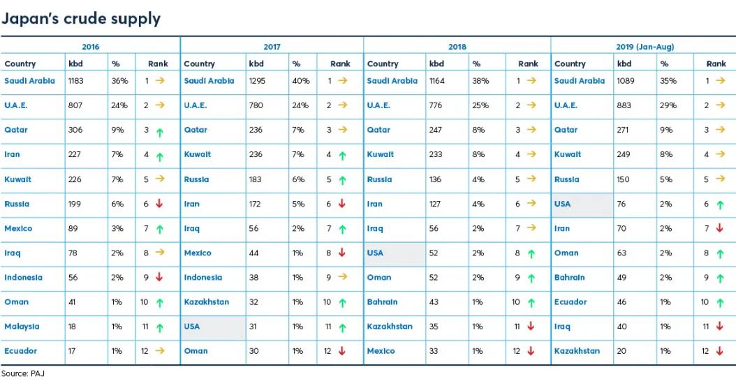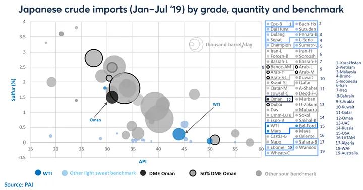 但从2019年开始,随着美国页岩油技术改良,以及特朗普贸易战大棒的威胁下,日本1-8月突然加大进口美国的轻质低硫油(WTI)