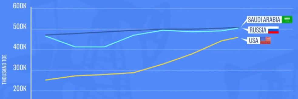 而且美国这条石油产量的黄色曲线增长颇为强劲,追赶速度之快,让沙特和俄罗斯心生恐惧