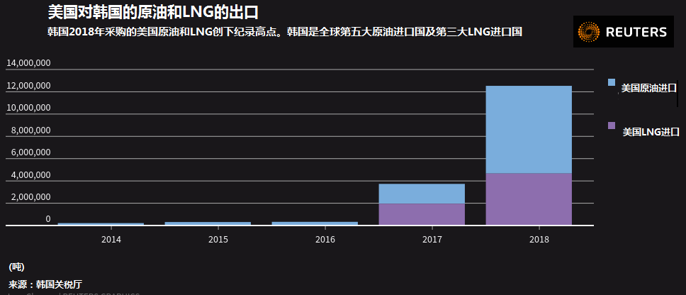 在去年短短两个月内,韩国就大手笔进口美国1800万桶原油,90万吨液化天然气(LNG)