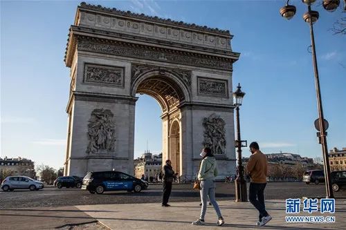 3月15日,在法国巴黎,人们走过凯旋门。