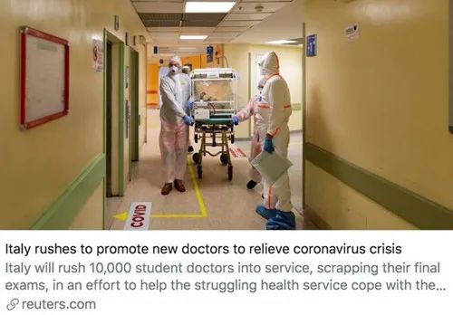 路透社报道:为了解决医护人员短缺的问题,意大利决定让10000名在读医学生提前毕业,而无需参加资格考试,并立即间接参与新冠疫情救治工作。