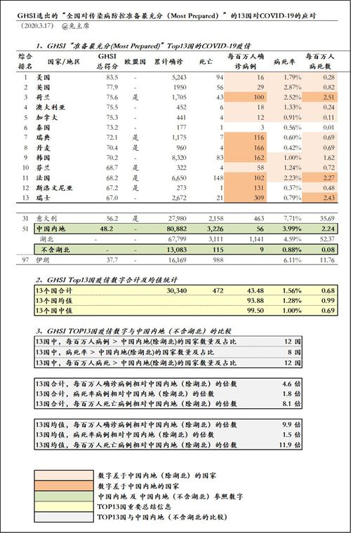 2019年10月,一份《全球卫生安全指数(Global Health Security Index》(“GHSI”)的报告,全面评估了195个国家防控传染病及全球流行病的能力。全球新冠肺炎疫情爆发后,有研究者对排名前13位的国家在对抗COVID-19的表现进行观察研究,并将数字与“中国内地”、“湖北”、“中国内地(不含湖北)”进行了比较。