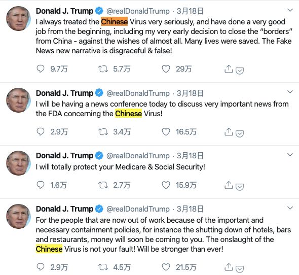 答:昨天,我已经非常明确地阐明了中方在这个问题上的立场。我们坚决反对美方把新冠病毒同中国相联系,反对美国对中国搞污名化的做法。我们多次说过,新冠病毒源头的问题是一个科学问题,需要听取科学和专业的意见。世卫组织和国际社会都明确反对将病毒同特定的国家和地区相联系,反对搞污名化。我们敦促美方尊重客观事实,尊重国际公论,立即纠正错误,立即停止对中国的污蔑和抹黑。同一天,短短几个小时内,特朗普在推文中三次将新冠病毒称为“中国病毒”,继续拉仇恨(见下图)。
