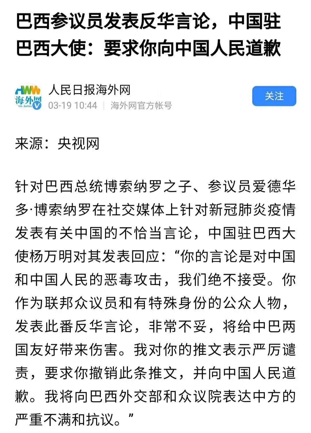 相比特朗普,巴西总统博索纳罗之子爱德华多·博索纳罗的批评更为赤裸。巴西总统博索纳罗是特朗普的好友,其子爱德华多更是特朗普的超级粉丝,他曾主动请缨当巴西驻美大使。这样的言论,显然不是那么简单。笔者留意到,意大利也有议员表达类似观点。想必,在其他地方批评声音也难以避免。这些“星星点点”的指责之声,最后会汇合成一股洪流?
