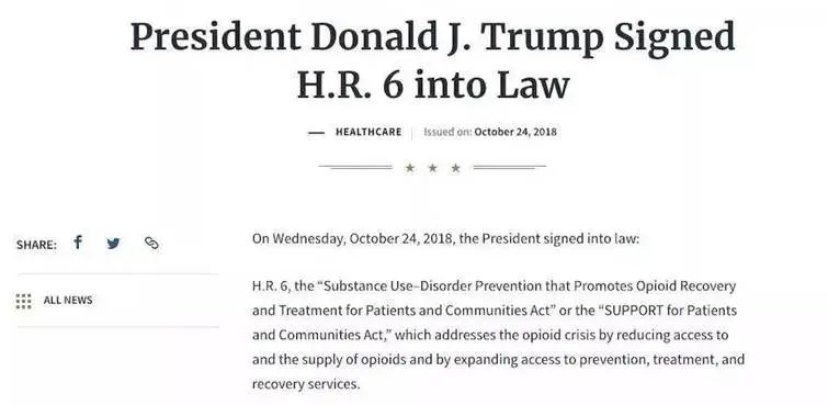 2018年10月24日,白宫签署了一项名为H.R.6的法案,旨在寻找治疗疼痛的替代性药物和疗法,遏制阿片(即鸦片)类止痛药物的泛滥。该法案将针灸、医疗按摩等项目均列为有待评估的替代性疗法。