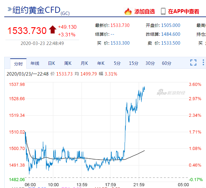 购买国债和MBS,是美联储“扩表”(货币宽松)的主要方式。其效果,有点类似中国的降准,释放的都是长期资金。这是因为特朗普2万亿美元的经济救助方案,在3月22日在参议院被否决。47名民主党议员都投了反对票。而共和党53名议员里,多人因为确诊新冠肺炎或者需要隔离,只有47人到场投票。最后的结果是47:47,特朗普折戟参议院(需要60票支持才能通过)。既然此路不通,特朗普就通过美联储来印钞。其首要目标,是先帮助美国金融市场止血,然后再考虑治病。最终目标,是获得11月大选胜利,连任美国总统。而民主党狙击特朗普的“2万亿美元刺激计划”,也是为了大选。最近一段时间,因为疫情发展太快,各国纷纷“封国、封城”,在金融市场引发空前混乱。当大家面对史无前例的风暴,不知道怎么办的时候,就倾向于持有现金,特别是美元。于是形成了“美元黑洞”。在上一篇稿件里,我分析了美元黑洞形成的原因,也给大家看了美元指数是如何狂飙的,全球主要货币是如何纷纷拜倒在美元石榴裙下的。没有足够的美元,更大的危机将被引爆,一些国家的财政、货币会崩溃。而美联储的“无限量印钞”,就是为了度过这个危机。美联储官宣之后,黄金立即做出了反应,纽约金价上涨超过3%。