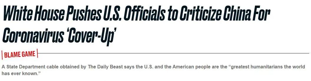 美国政治新闻网站“野兽日报”披露的信息证实了这一点。报道曝光了白宫近期发出的电文,要求美国国务院等多个联邦机构加强涉及中国的舆论战攻势,重点指责中国精心策划“掩盖”真相,制造全球疫情。