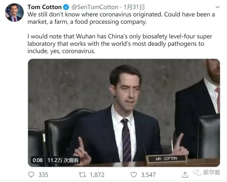 “(中国)泄露生物病毒”由此出笼。后来经过美参议员、参议院军事委员会成员汤姆·科顿、还有白宫国家贸易委员会主席纳瓦罗的操弄,再然后经过华尔街时报、福克斯新闻等右翼媒体的渲染,而引起西方舆论的共鸣,从而成为一个张狂且荒谬的话题。