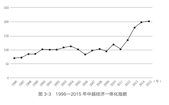 图3-3是1996—2015年中越经济一体化指数,我们从中可以看出,虽然中越经济一体化指数偶尔因为政治和经济危机出现短暂下跌,但总趋势是不断上升的,尤其是在2011年之后,经济一体化指数的上升态势极为显著。而且,一系列相关研究显示,不仅中国与越南之间的经济一体化程度在加深,而且中国同整个东南亚国家的一体化程度都有不断加深的趋势。