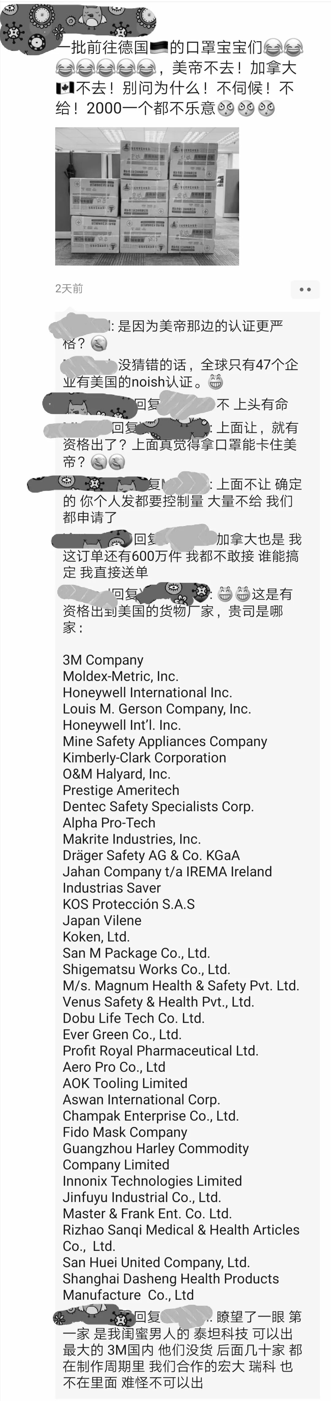 而且,大多数人都是在装逼,前天我一个读者给我发来他朋友圈里一个做口罩生意人发的,意思是出口德国,就是不给美国,多少钱也不给。