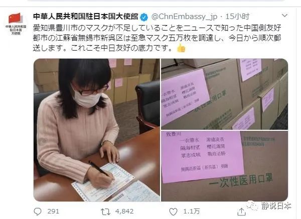 中国驻日本大使馆连夜发了一条推特,将无锡市新吴区已经起运5万只口罩捐给丰川市的消息做了报道。