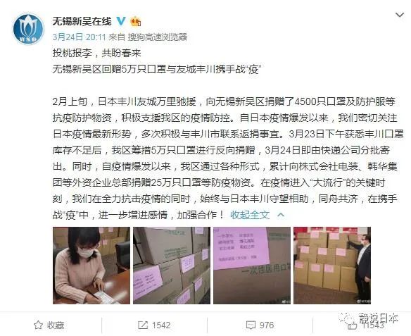 丰川市的“讨还口罩”,与无锡市新吴区的“十倍相送”,短短2天时间里,演绎出的各种故事,既让我们看到了中国驻日大使馆、无锡市新吴区政府珍惜中日友情,全力支援日本抗击疫情的真情实感,也让我们看到了中日两国民众那种相互理解相互支撑的友好情谊。