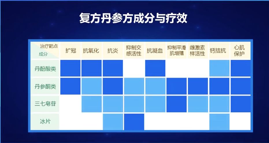 这里纵坐标指的复方丹参方的主要药效物质,它的化学成分主要是这些物质。横坐标是围绕心肌缺血的不同病理环节,它起什么样的作用。这也就回答了复方丹参方为什么能治冠心病,也就是说它除了能够扩冠,能够保护血管、保护心肌,还有中枢调节的作用,还有抗炎的作用,还有左室重构,还有血管再生等等,所以综合作用不比西药差。像这样的药,我们中药有多少?我们现在已经有几十个药达到了这种水平。我想以后随着中药现代化的进展,会有更多的药能够把它的原理揭示清楚。它起作用的药效物质是什么,作用机理是什么,在重大疾病治疗中会起到更好的作用。