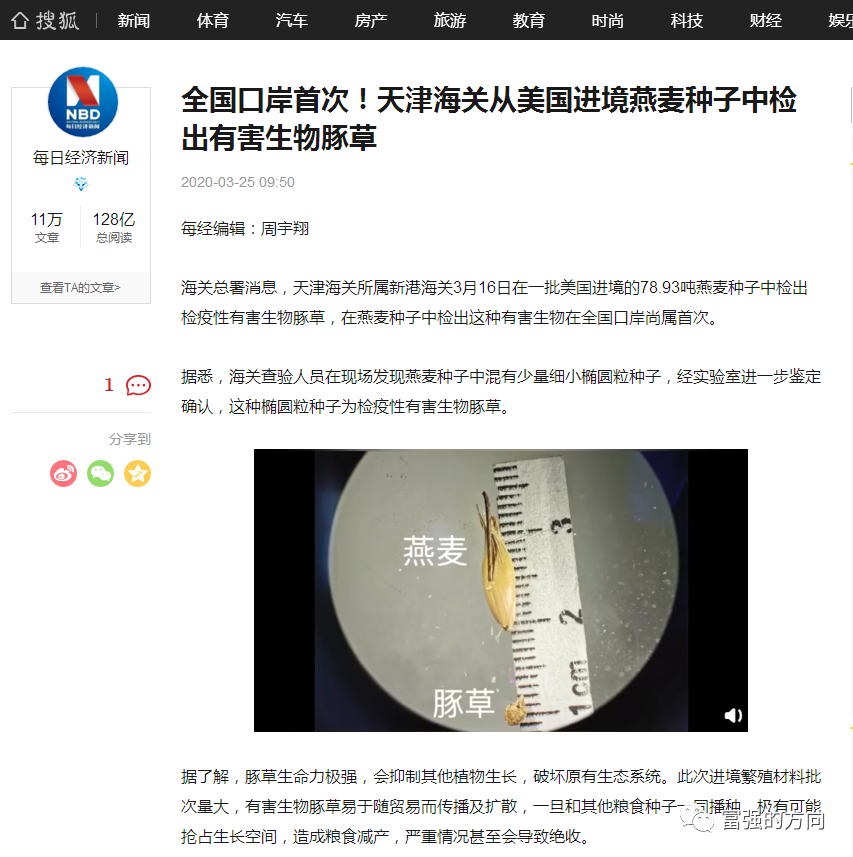 搜狐网的这一新闻,虽然强调了“在燕麦种子中检出这种有害生物尚属首次”,但阅读量很少,也没见其他更多媒体报道或者转载,更没有被列为要闻,我本人也是在别的文章中看到有提及,引发警惕,赶紧搜索新闻才找到的。