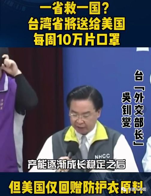 从这件事就能看出,湾湾确实充斥着“人才”,脑子在他们那真是个好东西。他们十分“自信”,并且求生欲极强,无论是在岛内还是“国际舞台”,都想露个脸。就拿疫情来说,大家都知道,现在岛内形势并不乐观,在这种情况下,菜菜子还主动跪舔美国粑粑,不顾民众反对,每周向美国提供10万只口罩的援助,而回报仅仅是可以用来做防护衣的原料。