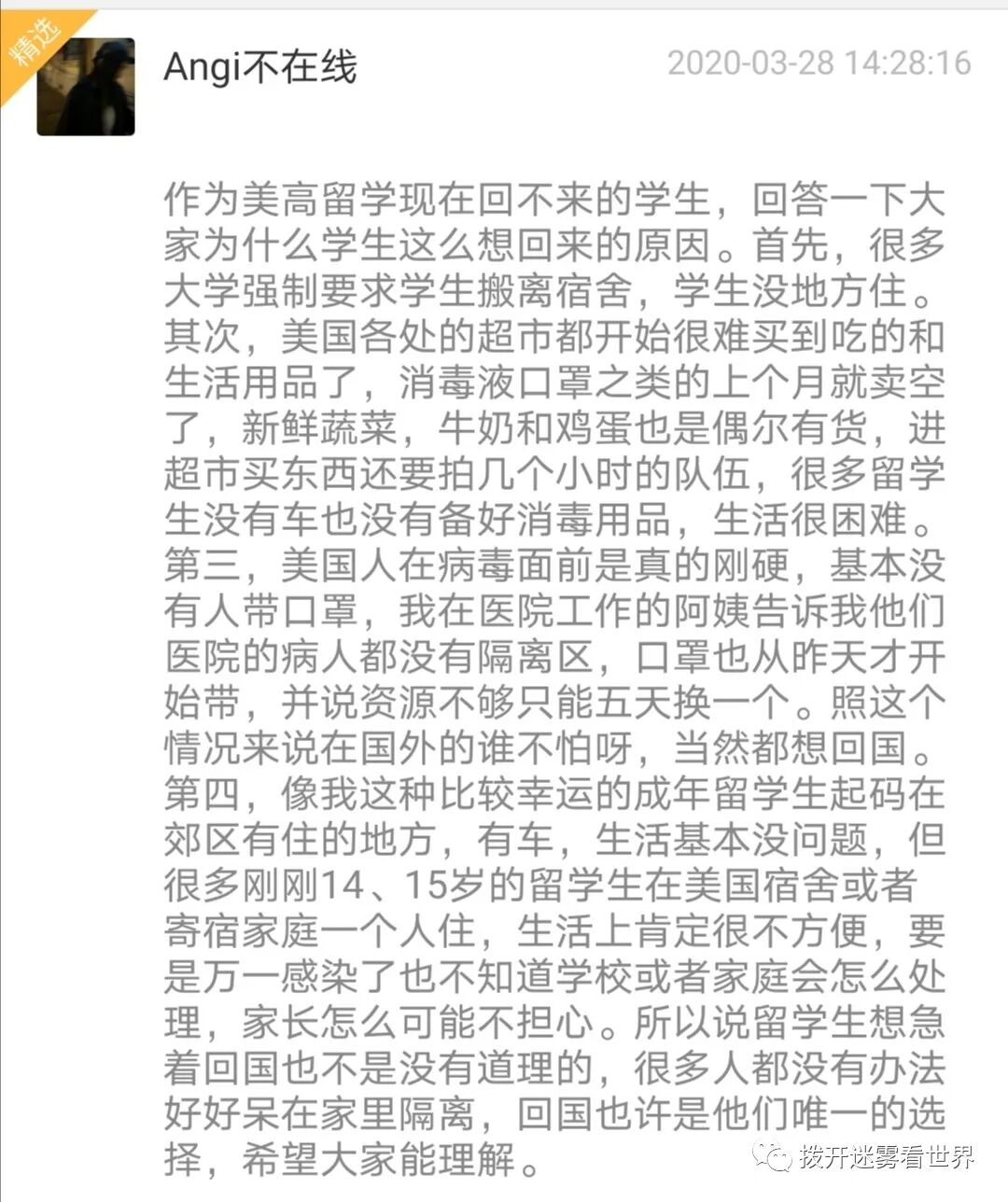 “我们理解一些留学生急于回国的想法,但希望留学人员和家长认真权衡利弊,做出正确选择。当前形势下,留在当地可以避免仓促回国引起交叉感染,或因中转国家边控措施而中途受阻,也可避免对学业、签证可能产生后续影响,这也符合世卫组织专业建议。”
