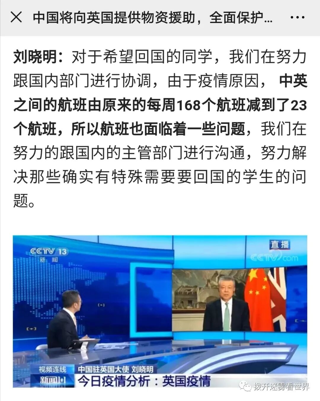中国驻英国大使刘晓明3月18日接受白岩松采访时说:“我们特别关注小留学生,他们很多都是寄住在一些英国人的家庭,不少是老年人家庭。现在按照英国政府规定,70岁以上老人要居家隔离。所以我们也在努力帮助他们寻找一些托管单位。”