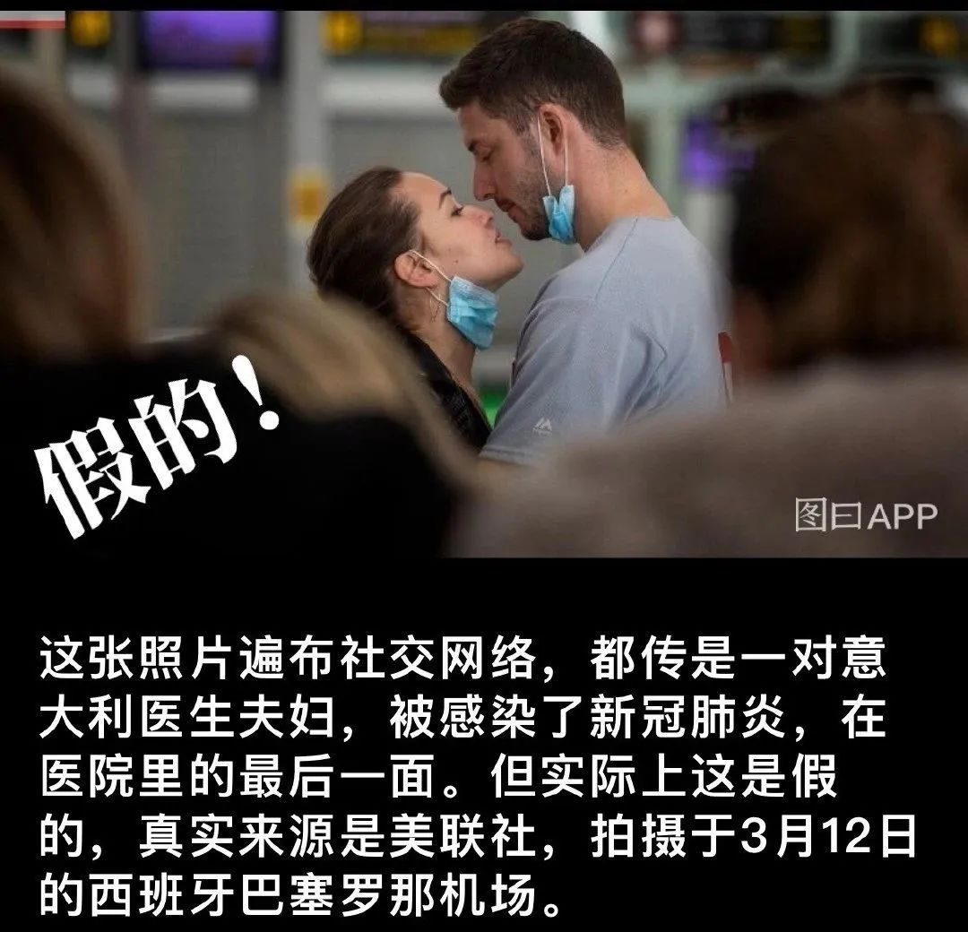 现在互联网的消息太多,各种信息真假难分,比如这张意大利夫妇的照片传遍网络,但实际上是假的,拍摄于西班牙巴塞罗那机场。