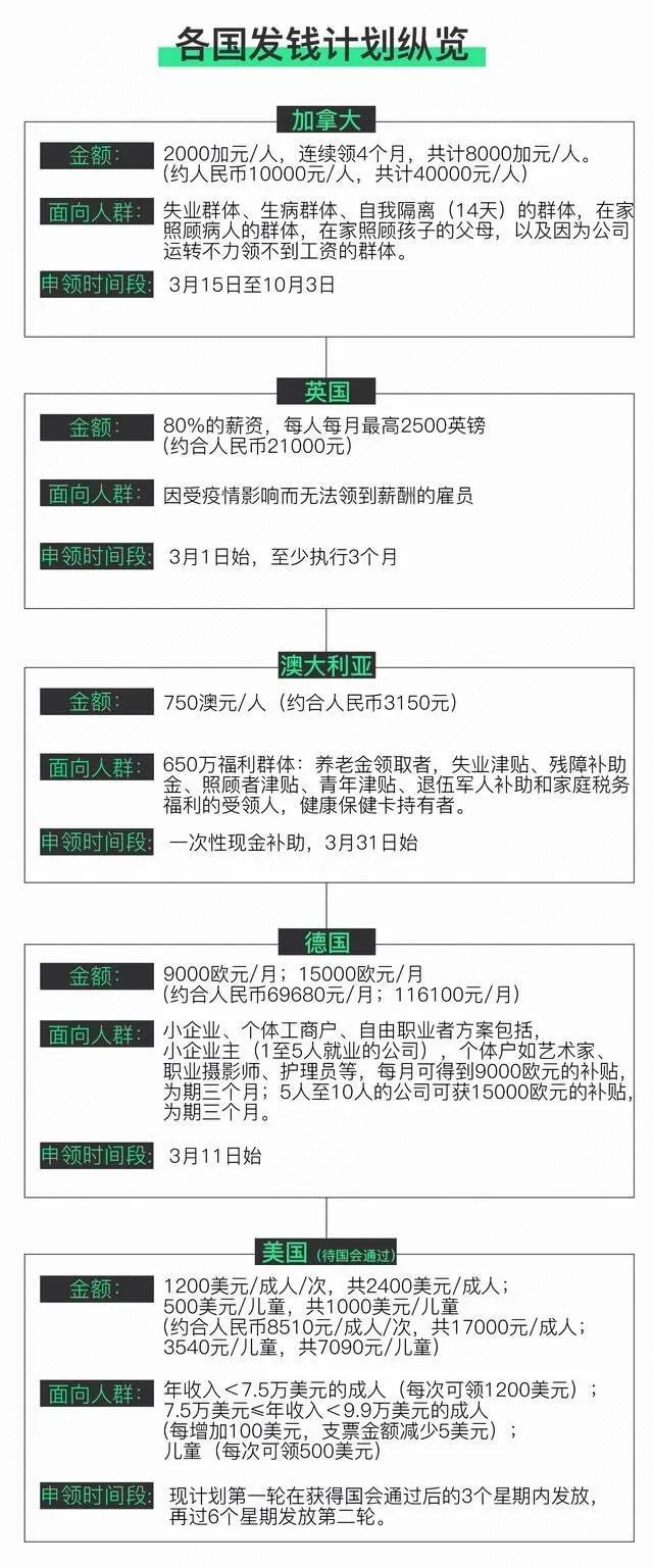 看一下这张各国疫情,欧美各国发钱计划表,就是力保各行各业、老百姓都生存下去。