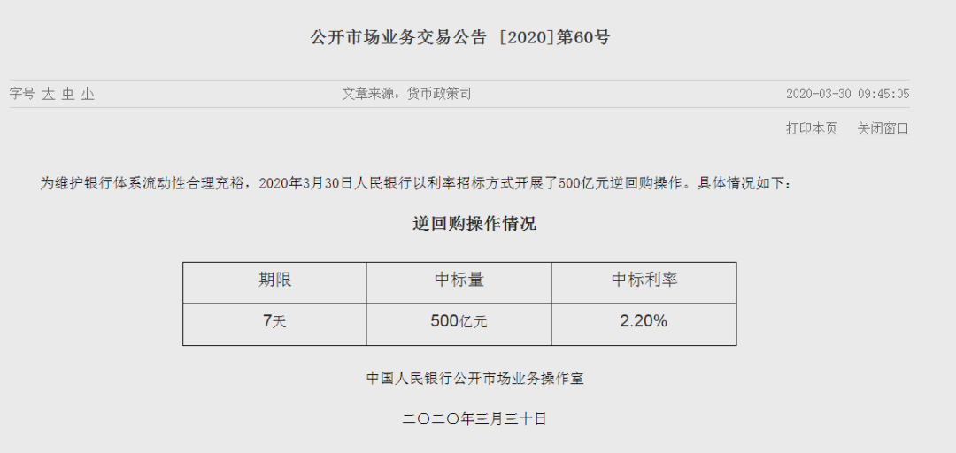 今天(3月30日)上午9点45分,央行公布了最新一次逆回购招标公告。公告显示,7天逆回购一次大幅降息了20个基点。