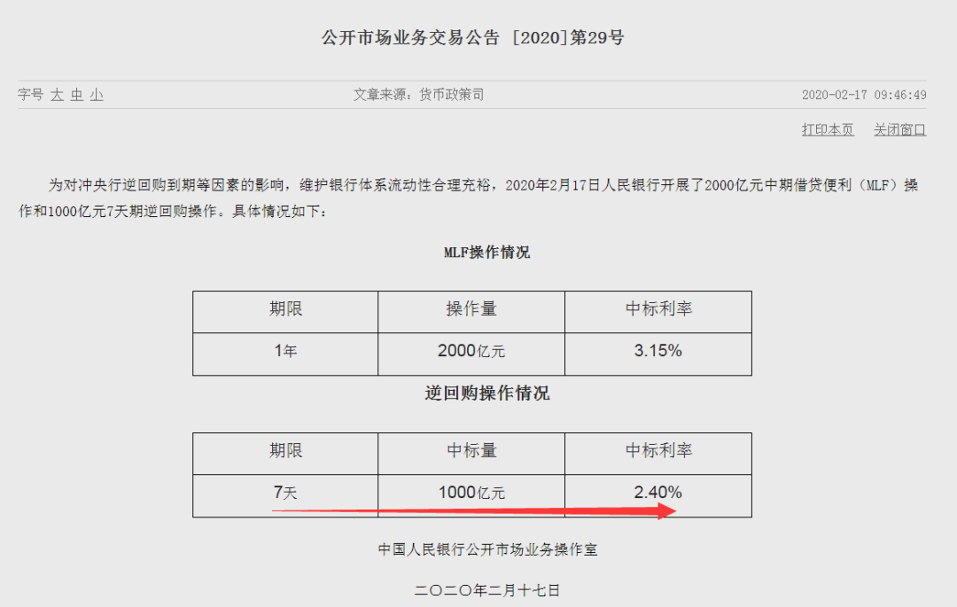 上图是今天的招标公告,7天逆回购的中标利率是2.20%。