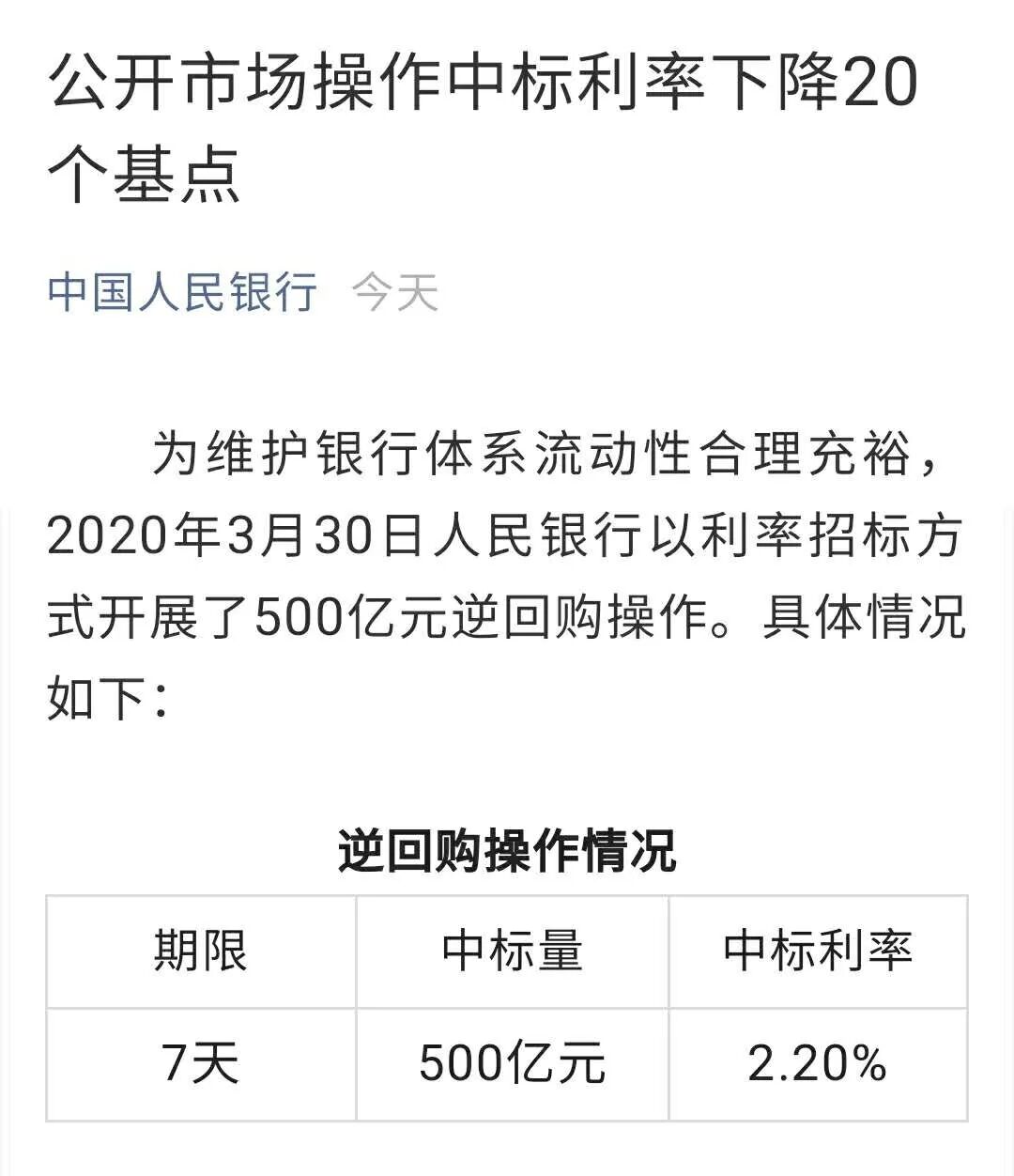 3月30日,央行开展了500亿元逆回购操作,操作期限为7天期,中标利率2.20%,此前为2.4%,相比下降了20个基点。这是时隔近1个月之后,央行再次通过逆回购向市场释放流动性。利率下降20个基点,给4月份的LPR降息带来无限想象空间。