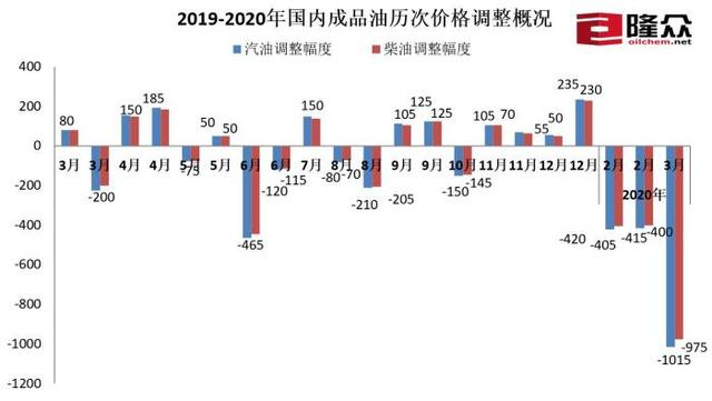 截至日前,2020年国内成品油共调价五次,汽油累计跌幅为1850元/吨,柴油跌幅1780元/吨。