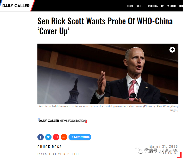 共和党参议员里克·斯科特(Sen. Rick Scott)发表一项声明,指责世卫组织称赞中国应对疫情的表现和透明度。
