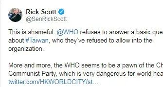 斯科特同时在其推特上指责世卫组织拒绝台湾加入世卫组织,为台湾鸣不平。