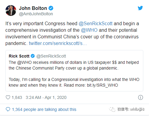 前美国国家安全顾问约翰·博尔顿(John Bolton)在斯科特发出声明后不久立刻在其推特上发文表示支持。声称:“非常重要的是,国会听取斯科特参议员的呼声,并对世卫组织及其有可能参与共产中国掩盖新冠病毒大流行病的问题展开全面调查,”