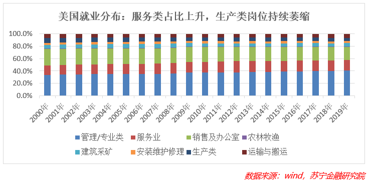 就业数据显示,2000年以来,美国生产类岗位占比持续萎缩。