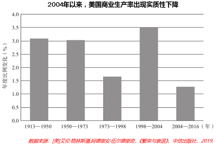 据格林斯潘测算,2004年以来,美国商业生产率出现实质性下降,远低于近百年来的平均水平。如2010-2017年,美国以每小时商业产出来衡量的社会生产力年均增长仅为0.66%,而此前的六十年里则为2.5%。