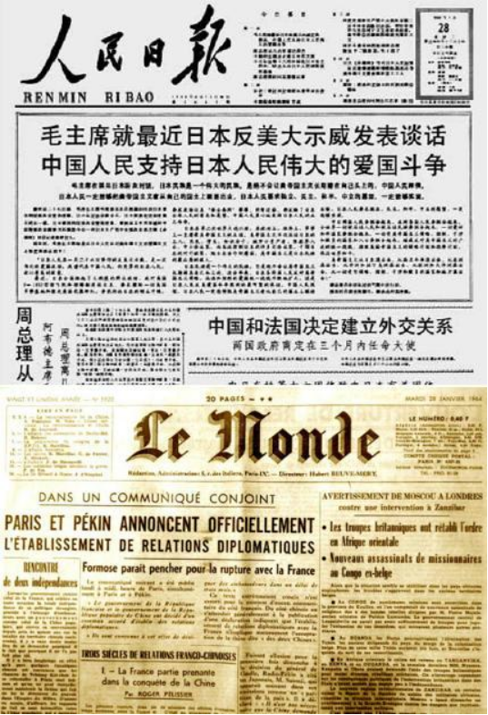 “Unis nous vaincrons”出自法国文豪雨果的名言,意为“团结定能胜利”。雨果是法国19世纪前期积极浪漫主义文学的代表作家,代表作有长篇小说《巴黎圣母院》《九三年》和《悲惨世界》。雨果一生的创作时期长达六十年之久,他前期的创作,基本上是站在资产阶级人道主义立场上,同情人民疾苦,希望通过改良社会,解决矛盾。因此,罗曼·罗兰赞扬他道:“在文学界和艺术界的所有伟人中,雨果是惟一活在法兰西人民心中的伟人。”“千里同好,坚于金石”,出自三国谯周的《谯子·齐交》,原文为“交得其道,千里同好,固于胶漆,坚于金石”,意思是:如果坚持正确的交友之道,那么即使双方远隔千里,友谊也会比胶漆还要牢固,比金石还要坚实。原文中,谯周认为,如果把交往之道用物品来比喻,就像没有染色的丝绸一样,用蓼蓝一染就会变青;人在社会生活中和人交往,和这是一个道理。他在文中举了几个例子:春秋时的韩起与晋国贤人田苏相处,成就了好仁之名;战国时的甘茂就学于史举,学百家之说,在齐、秦两国建立了显达的功业;西汉初年的曹参拜道家大师盖公为师,终于成就了“休息无为”的清净之治;西汉窦皇后的两个兄弟窦长君、窦少君虽出身贱隶,但对有德行的师友恭谨有加,都成了谦让有礼的君子。接着引用《荀子·劝学》“蓬生麻中,不扶而直”之语,论证成长环境的重要性。最后得出结论:“千里同好,固于胶漆,坚于金石。”意思是,即使千里之远也可同心交好,做到友谊牢固如胶似漆,情谊坚定堪比金石。贫穷显贵都不会使其分开,谗言美誉也都不会怀疑其真实的情谊。历史上,中法建交经过多年商议会晤,1964年1月27日,两国政府在北京和巴黎同时发表了仅有两句话的建交公报:中华人民共和国政府和法兰西共和国政府一致决定建立外交关系。短短44字的中法建交公报,轰动国际社会,被国际舆论称为“外交核爆”。1964年1月28日,中国《人民日报》和法国《世界报》同时在头版刊登中法两国建交消息3月30日,从我国起飞载有政府订购及中企捐助约800万只口罩的货机已抵达巴黎瓦特里机场。相信,只要法国政府能始终与我国保持正确的交友之道,来自我国的援助和爱心就永远在路上。中国运往意大利的援助物资上,附有明代文学家李日华诗作《赠大西国高士利玛窦其二》中的诗句,意指:期盼疫情早日过去,真正的春天早日来临。全诗为:利玛窦是明末来华的意大利传教士,他于万历十年(1582)漂洋过海抵达澳门,次年来到广州,最终定居北京,在中国住了28年,与中国的许多士大夫结下了深厚的友谊。在中国,利玛窦除潜心研究中国文化外,还当起了老师,把自己擅长的西方天文、数学、地理等科学知识传授给中国人。来到北京后,利玛窦结识了徐光启,并收其为徒,在利玛窦的悉心教习下,徐光启编纂了《崇祯历法》(该书奠定了我国现行农历的基础),还帮助利玛窦翻译出《几何原本》,把古希腊的数学名著介绍到中国。写下这句诗的李日华,当时为江西九江府知府,深受百姓爱戴。李日华颇有文学天赋。1597年,他在省府南昌公干时,遇到了耶稣会士利玛窦,于是他写下这首诗表达了自己的羡慕之情。
