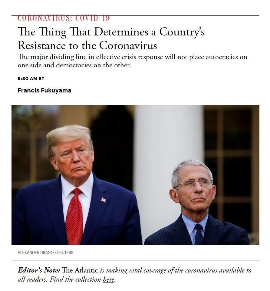 【导读】近期,因新冠肺炎疫情而引发的“体制之争”纷扰不止。著名学者弗朗西斯·福山(Francis Fukuyama)在《大西洋月刊》刊文指出,无论民主政体还是所谓的集权政体,都可能出现抗疫成功的典型,也都可能出现失利的败笔。他认为,疫情让人更加认清一个事实,那就是在政治体制上,并没有绝对的优劣,只有在“国家能力”上,国与国之间才会分出高下。“重要的不是政体类型,而是公民是否信任他们的领导人,以及这些领导人是否领导着一个称职而有效的国家。”福山以美国为例,认为美国虽然一直奉行三权分立、权力制衡,但在历次重大危机之后,美国事实上形成了非常时期为行政系统授权、平常时期从行政系统收权的传统。在汹涌疫情面前,美国政府并不会被体制束缚手脚,真正令人担心的是:特朗普当局失误所造成的公信力流失,会导致美国政府与民众在抗疫过程中,无法做到上下同欲、风雨同舟。这种上下撕裂的危机,是很多美国人对疫情控制乃至美国未来感到忧心的根源所在。