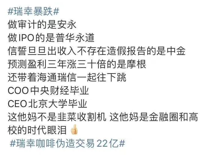 美国股市不仅有中概股,也有大量中资甚至国资,到底瑞幸割了谁家韭菜,等美方调查结果再定论。既然吹牛作妖能在金融市场赚大钱,就要允许职业捉妖人靠揭穿谎言发财,而且是发大财。瑞幸咖啡这次可能真过不去了。和疫情无关,单纯是胆儿太肥,活活撑死了!